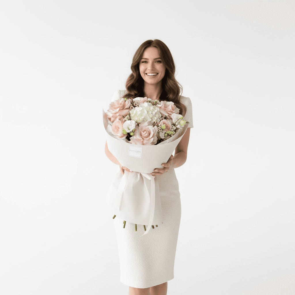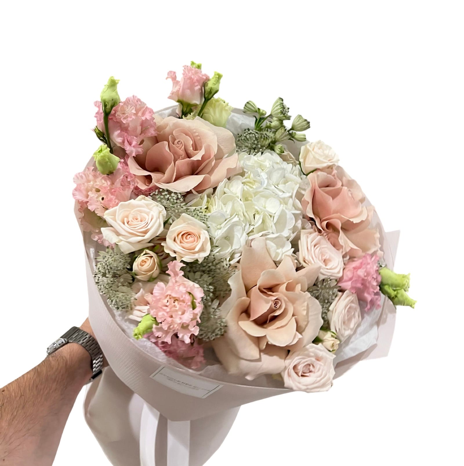 Continut buchet: 3xTrandafir , 1x Hydrangea , 3x Miniroze 2x Eustome , 3x ambalaj si alte flori decorative