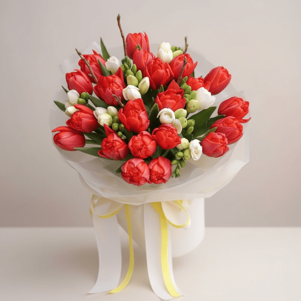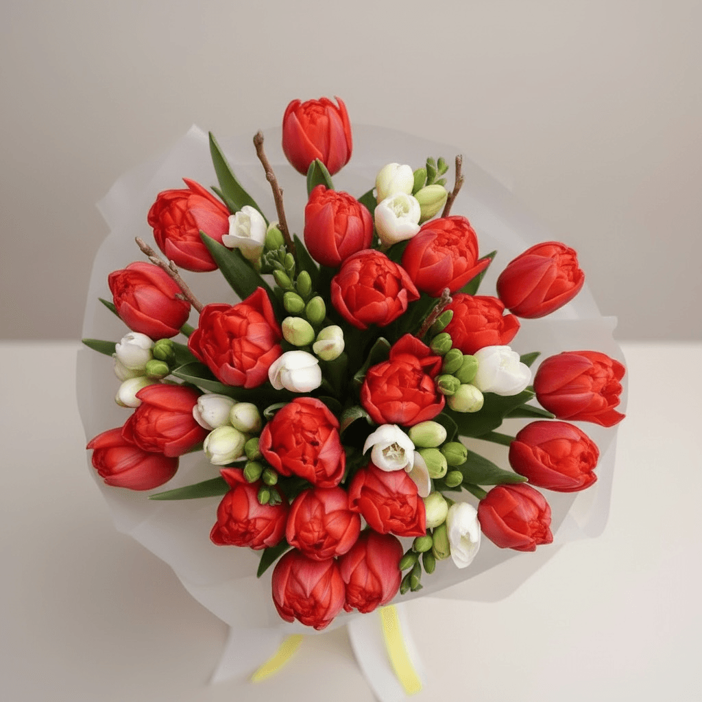 Acest Buchet de Lalele Roșii& frezii – 8 Martie dă naștere unui ansamblu floral de vis. Fie că alegi să le oferi cuiva drag sau să le cumperi pentru tine, un buchet de trandafiri rosii ambalat elegant, nu va dezamăgi niciodată prin frumusețea și puritatea sa naturală.