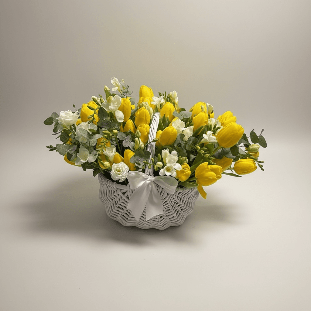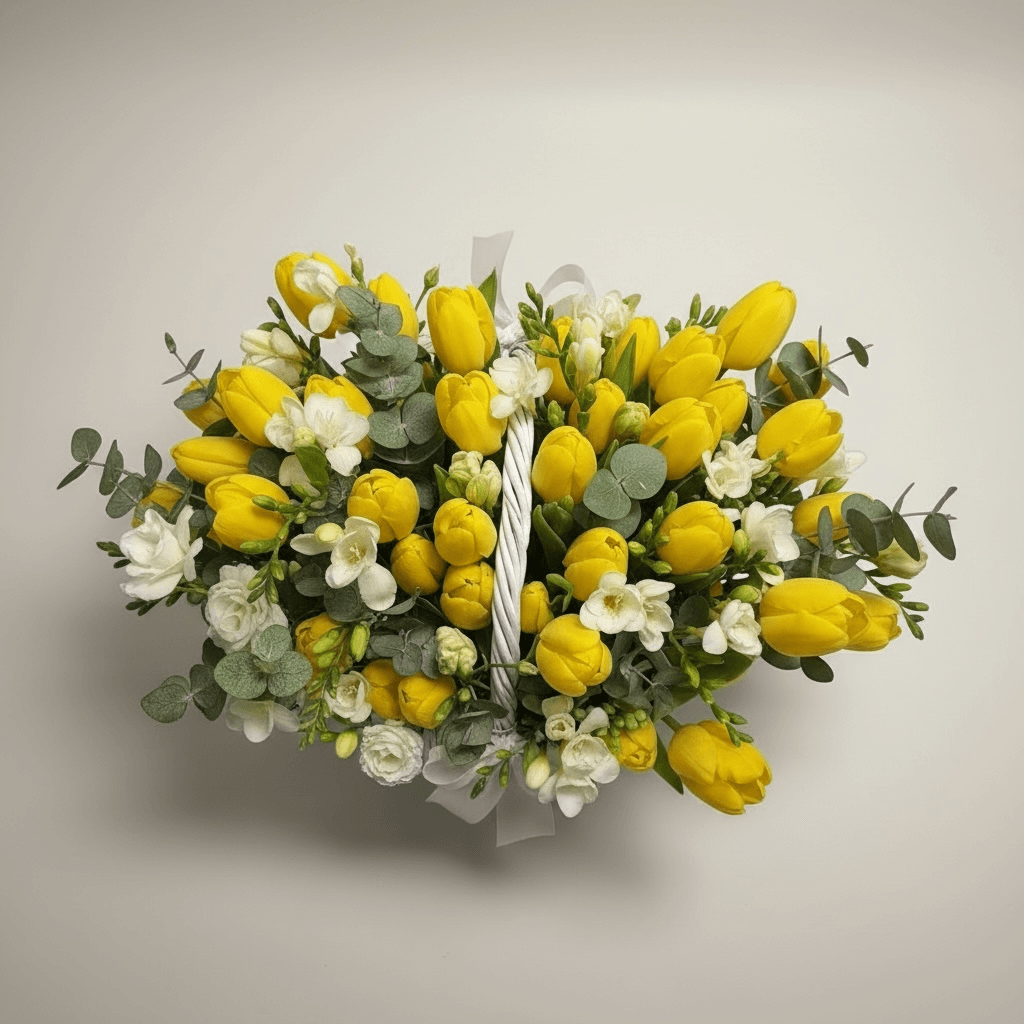 Continut aranjament Standard: 11x lalele, 4x frezii, 3x eucalipt