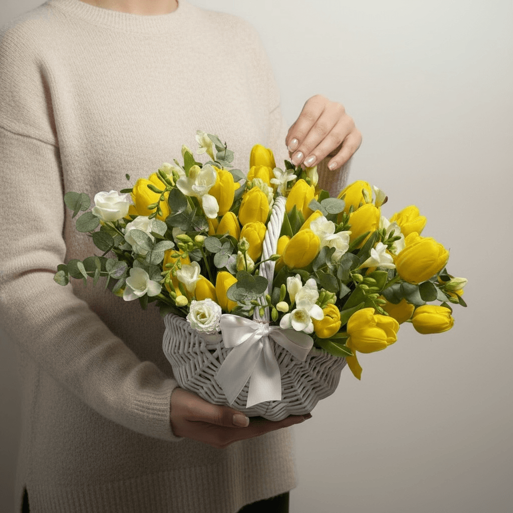 Continut aranjament Premium: 21x lalele, 8xfrezii, 7x eucalipt